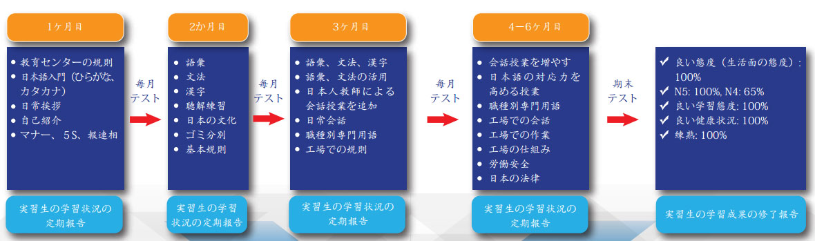 » Quy định của trung tâm » Nhập môn tiếng Nhật (Hiragana, Katakana) » Chào hỏi hàng ngày » Giới thiệu bản thân » Quy tắc 5S, báo cáo | » Học từ vựng » Học ngữ pháp » Học hán tự » Luyện nghe » Học văn hóa Nhật Bản » Học cách phân loại rác | » Học từ vựng, ngữ pháp, hán tự » Luyện tập từ vựng, ngữ pháp » Luyện giao tiếp tiếng Nhật » Giao tiếp hàng ngày » Học từ vựng chuyên ngành » Học quy tắc ở công trường | » Tăng cường giao tiếp » Khóa nâng cao ứng dụng tiếng Nhật » Học từ vựng chuyên ngành » Giao tiếp trong công trường » Thao tác trong công trường » Cơ cấu bộ máy trong công trường » Học an toàn lao động » Học luật pháp Nhật | » Ý thức tốt: 100% » N5: 100%, N4: 65% » Thái độ học tập tốt: 100% » Tình trạng sức khỏe tốt: 100% » Chuyên cần: 100% | ||||